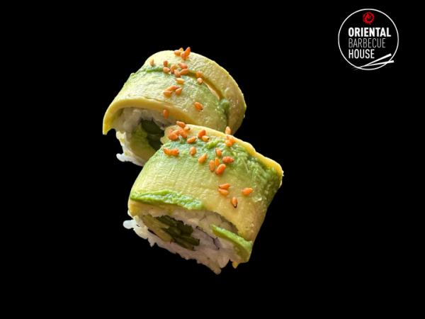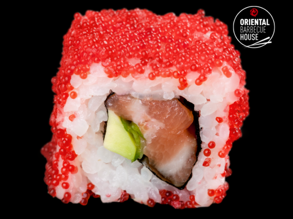 Crispy ebi and crunchy asparagus – topped with flame-seared salmon & tuna, teriyaki, chili mayo, green & orange tobiko and fresh cress. A roll of fire & ocean flavors. 🔥🌊🍣
