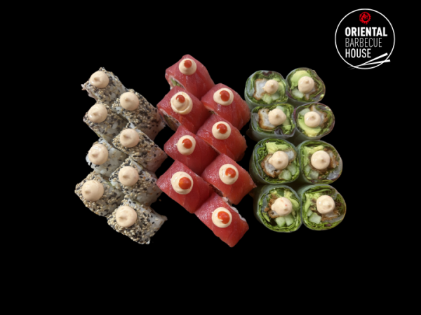 Forkæl smagsløgene til sushi elsker – 34 stk. frisklavet sushi med alt fra sprød crispy ebi til flamberet laks og tun. En perfekt kombination af klassiske favoritter og luksus-maki, toppet med hjemmelavet persillemayo, chilimayo og frisk avocado 🥑✨