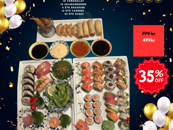 42 stk. sushi ,8 stk. varm forretter 2 Starters: 1 Tangsalat, 1 Edamamebønne 12 stk vaem :4 stk Gyoza med kylling 4 x stk Tempura rejer, 4 Hjemmelavet Forårsrulle Sashimi:2 stk laks, 2 Tun Nigiri: 2x stk flamberet Laks 2x stk flamberet Tun Uramaki: 4 stk Delux laks- rejer toppen med laks 4 stk Fireworks —crispy ebi toppet med laks og flamberet tun 4 stk rainbow 4 stk Crispy ebi 4 stk Tun roll 4 stk Alaska Futomaki: 6 stk, Ebi tempura Hosomaki: 8 stk.Tempura rejer, Ekstra tilbehør: Spicy mayo, Sweet chili, teriyaki, wasabi og ingefær, sojasovs