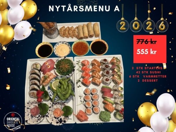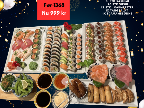 98 stk. sushi. 12 stk. varm forretter, 8 stk Sashimi Normal pris: 1399 kr. Nytårspris 998 kr. spar 28% Starters: 1 Tangsalat 1 Soyabønner 4 stk Gyoza med kylling 4 stk Tempura rejer 4 stk Hjemmelavetforårsruller Sashimi: 4 stk laks Sashimi 4 x tun Sashimi Nigiri: 4 stk, flamberet Laks 4 stk, fiamberet Tun 4 stk. flamberet rejer Uramaki: 8 stk deluxe laks 8 stk fireworks 8 stk Ebi Rainbow. 8 stk crispy ebi 8 stk tun roll 8 stk Alaska Futomaki: 12 stk.ebi tempura 12 stk.spicy laks Hosomaki: 8 stk. Laks. Rispapirruler: 6 stk laks Ekstra tilbehør: Spicy mayo, Sweet chili, teriyaki, wasabi og ingefær, sojasovsNytårsmenu 1