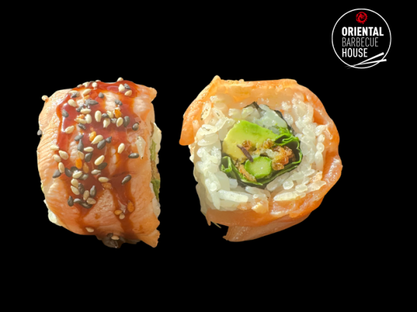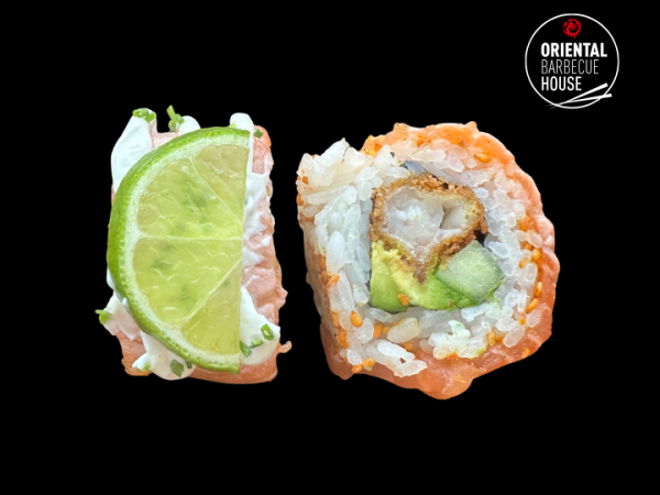 Crispy ebi, avocado og agurk – toppet med flamberet laks, japansk mayo og et strejf af lime. En frisk og luksuriøs rulle med ekstra glød. 🌠🍣