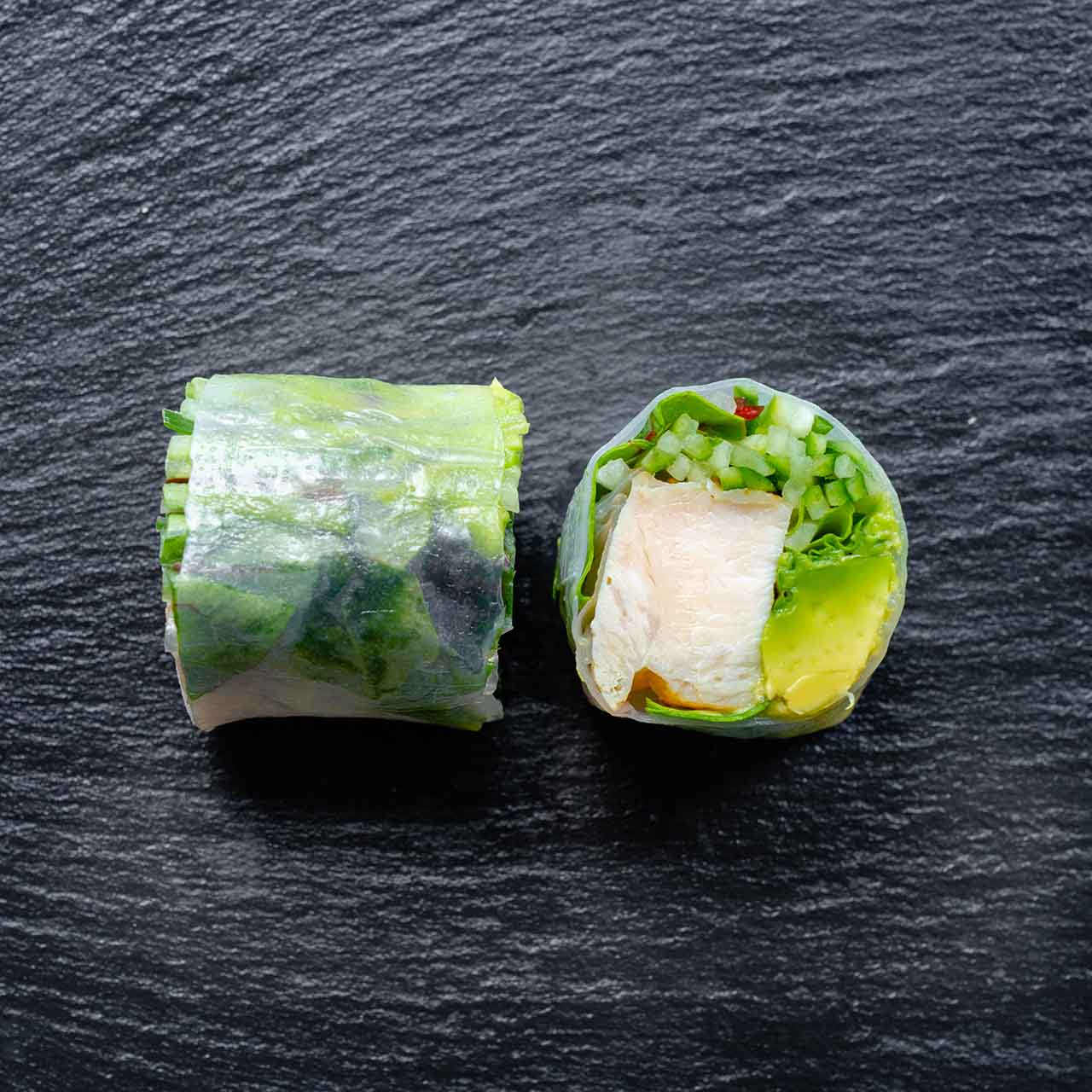 6 stk. kylling i rispapir, avocado, agurk, salat & goma dressing