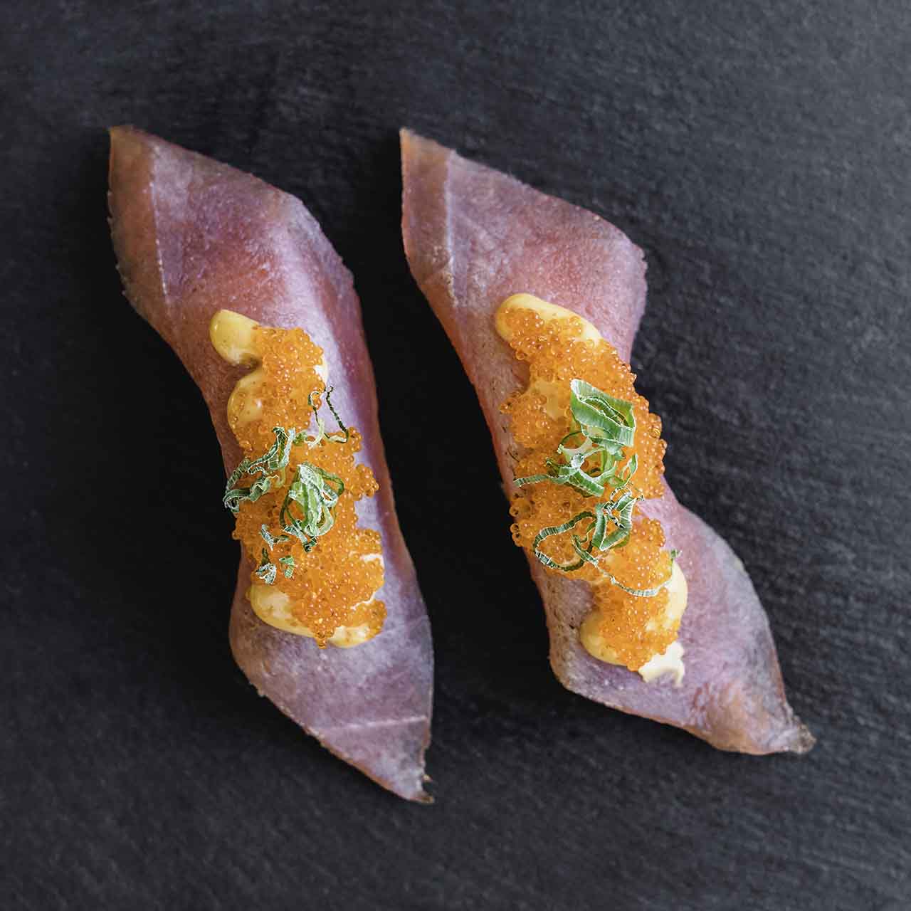 Nigiri med Flambere frisk tun toppet med chilimayo, tobiko og urter – en farverig og spicy favorit. 🌶🍣