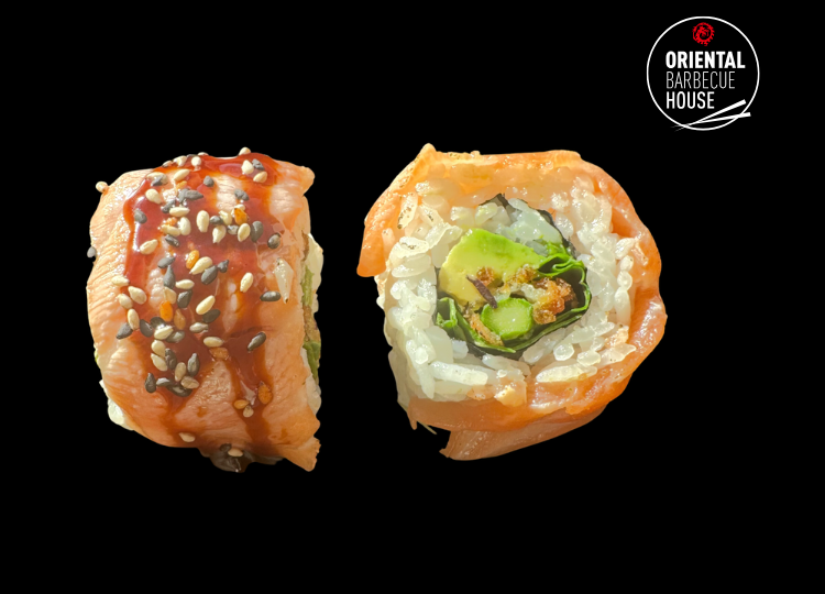 Tempura asparges, mixed salat og avocado – toppet med flamberet laks og teriyaki. En sprød og cremet rulle med en varm, røget smag. 🌅🍣