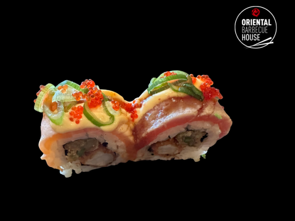 Crispy ebi and crunchy asparagus – topped with flame-seared salmon & tuna, teriyaki, chili mayo, green & orange tobiko and fresh cress. A roll of fire & ocean flavors. 🔥🌊🍣